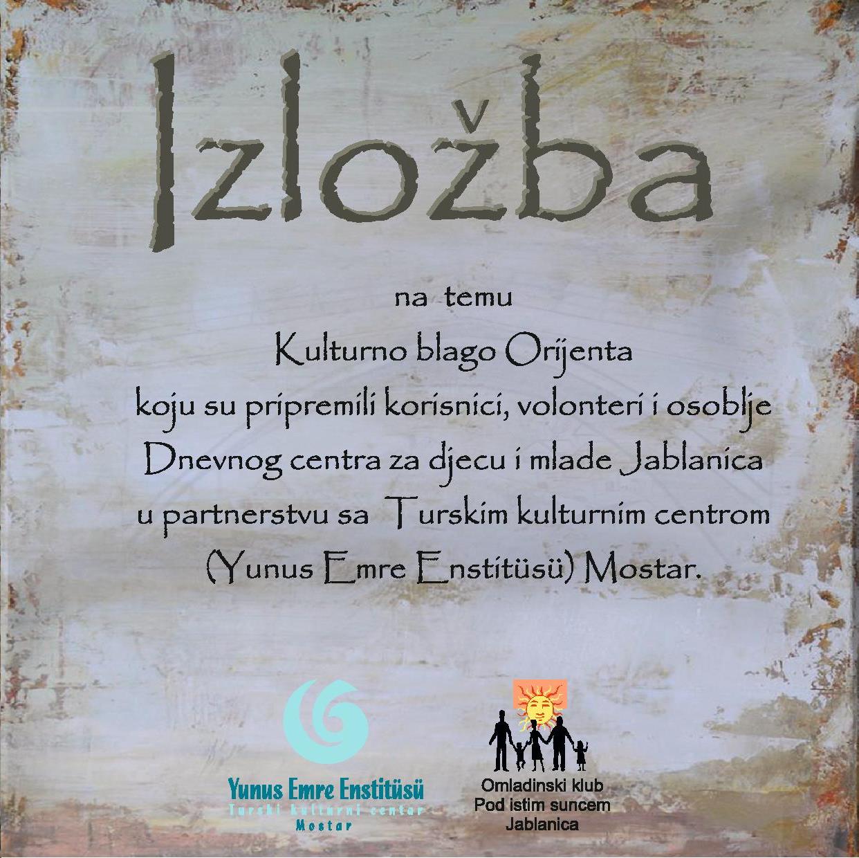 Mostar Yunus Emre Enstitüsüve Jablanica'daki 'Pod istim suncem' Gençlik Kulübü’nün ortaklaşa düzenlendiği 'Orient Kültür Hazineleri' Sergisi gerçekleştirilecektir.
