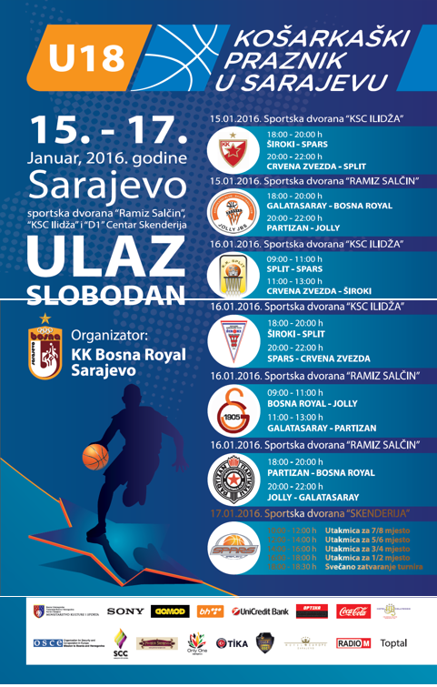 Saraybosna’da 15-17 Ocak 2016 tarihlerinde toplam 8 farklı takımın katılacağı U18 (18 yaş altı) Basketbol Turnuvası düzenlenecektir. Sözkonusu basketbol turnuvasına ülkemizden Galatasaray U18 Basketbol takımı da katılacaktır. Turnuva maçları; Skenderija, Ramiz Salčinve KSC Ilidža stadyumlarında oynanacak olup, turnuvaya katılacak takımlar aşağıda sunulmaktadır.